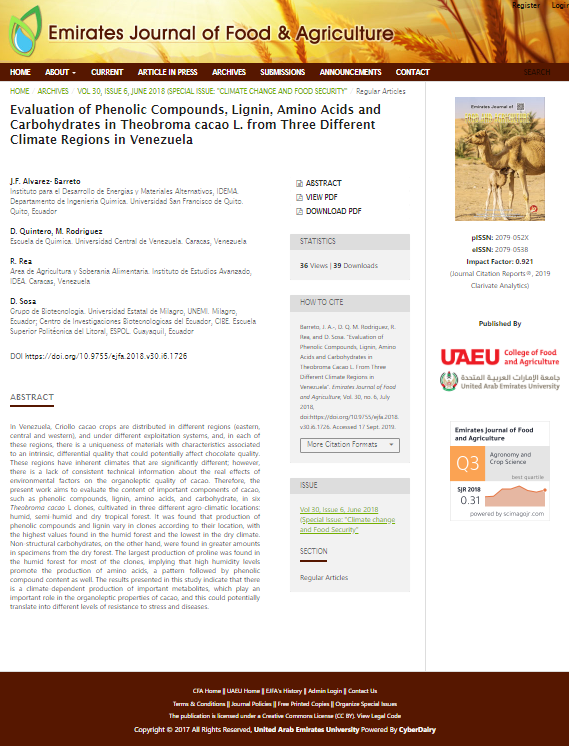 J.F. Álvarez-Barreto, D. Quintero, M. Rodríguez, R. Rea, D. Sosa. Emirates Journal of Food and Agriculture. 2018. 30(6): 522-530.