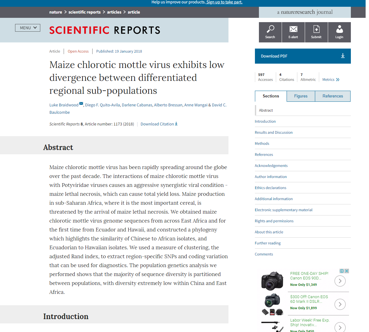Braidwood, L., Quito-Ávila, D.F., Cabanas, D, Bressan, A., Wangai, A., Baulcombe, D.C. Scientific Reports, Nature, Volume 8, Issue 1, January 2018.